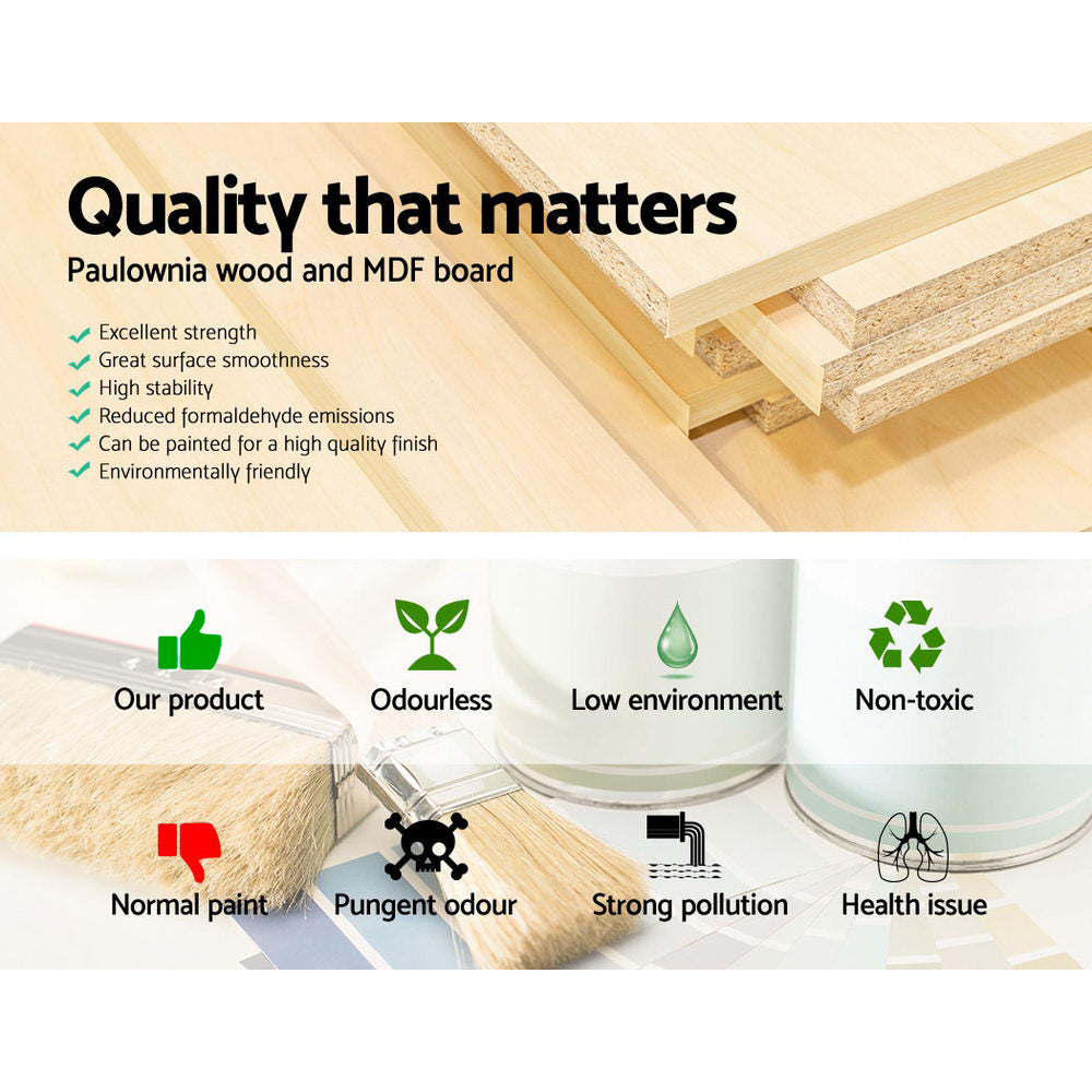 With its vintage chic, our Artiss Sage Bedside Table is as stylish as it is practical. The 18cm thickness Paulownia wood and MDF construction ensure that the furniture piece is able to withstand daily robust use. The drawers are deep and run smoothly. Use it in any space or in any room where the convenient and compact drawers will do wonders to your storage needs. Finished in an eco-friendly non-toxic paint, the ensemble also includes antique-inspired handles, a neat backing and anti-scratch feet pads.