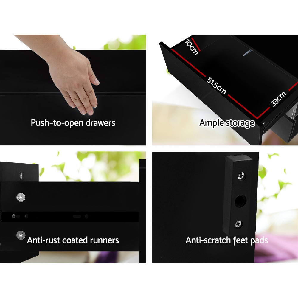 Tired of fumbling in the dark for a light switch in the middle of the night? With our Artiss Lume LED Bedside Table, your problems are solved. The bedside table comes with built-in RGB LED lighting that can be customised into 16 different colours to suit your preference. Not only will the table create a beautiful ambience, it will also save you from buying extra bedside lamps or nightlights. Available in black and white, the bedside table will be the perfect addition for your modern bedroom with its contemporary and linear design. Or you can keep one in the living room to wow all your houseguests. The two drawers have push-to-open mechanisms to maintain the sleek appearance and they provide ample storage for all your bedside, or living room, essentials.