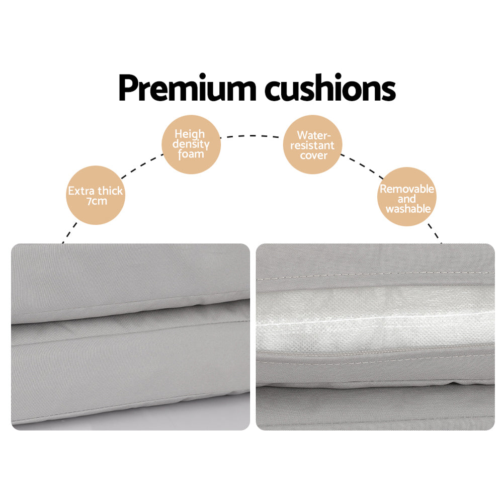 Experience the best the outdoors has to offer with this Gardeon 5-piece Outdoor Dining Set. Featuring four single chairs and a matching dining table, this set is perfect for sitting outside and watching the world go by in comfort and style. The set is made using powder-coated aluminium for rust and water resistance and handwoven rope for style, while the outdoor cushions feature water and UV-resistant covers and thick 7cm high-density foam for comfort. It is easy to assemble and features non-slip feet to keep everything in its place. The coffee table features a durable tempered glass tabletop to hold all of your favourite drinks, reading materials or outdoor games. Maintenance is as easy as wiping down the furniture, and you can remove the cushion covers for even easier cleaning. So what are you waiting for? Make the most out of the beautiful weather with a Gardeon 5-piece Outdoor Dining Set.